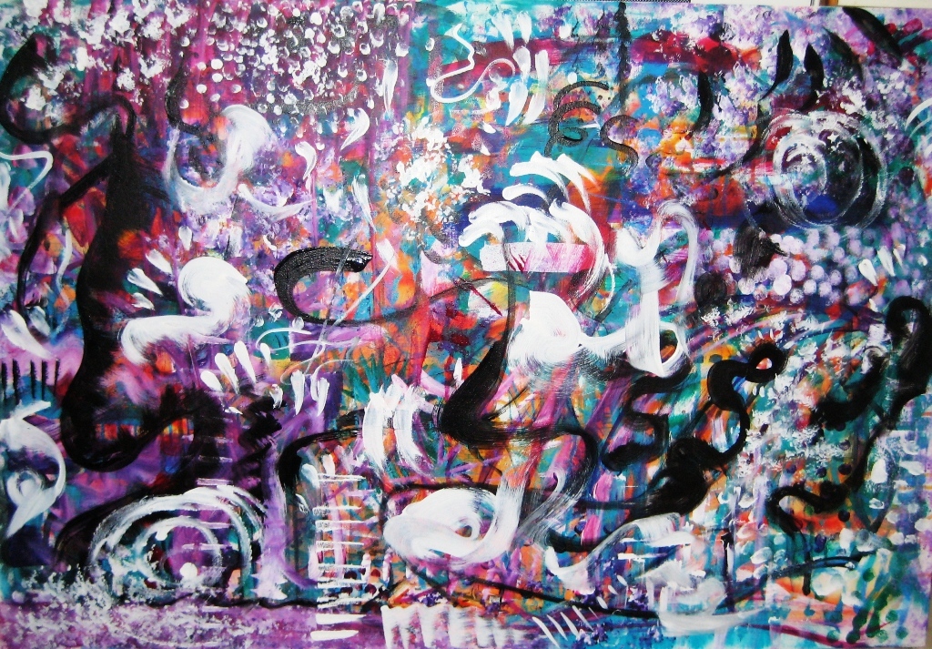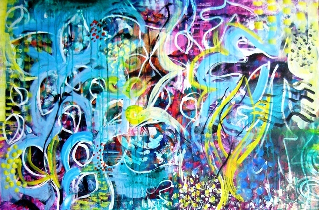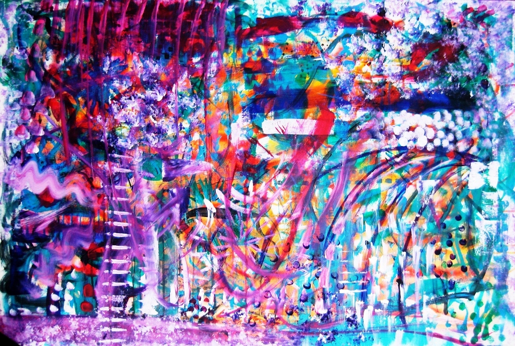 11. Admission: There’s no photo for this layer as at this point, I had a meltdown. I tried to ‘finish’ the painting and HATED it. In a strop, I went out for a walk. When I came back (still fuming) an hour later, I couldn’t bear to leave the painting as it was, so I started furiously chucking paint at the canvas. After a while, I realised I quite liked what was happening. So I carried on.
